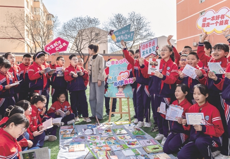南茶坊小学学生在“图书漂流集市”推荐图书。