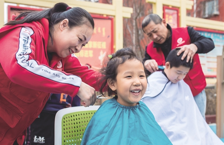 志愿者为社区居民理发。