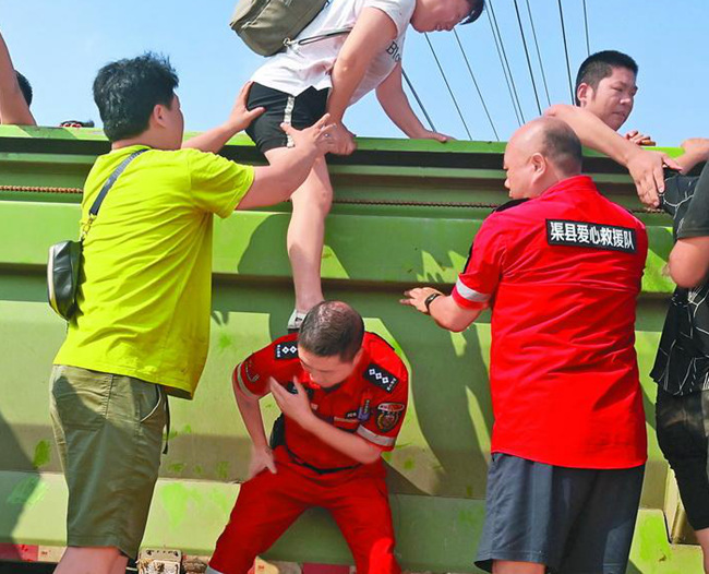 赵忠(弯腰下蹲者)在救援行动中转移人员。渠县爱心志愿者协会 供图