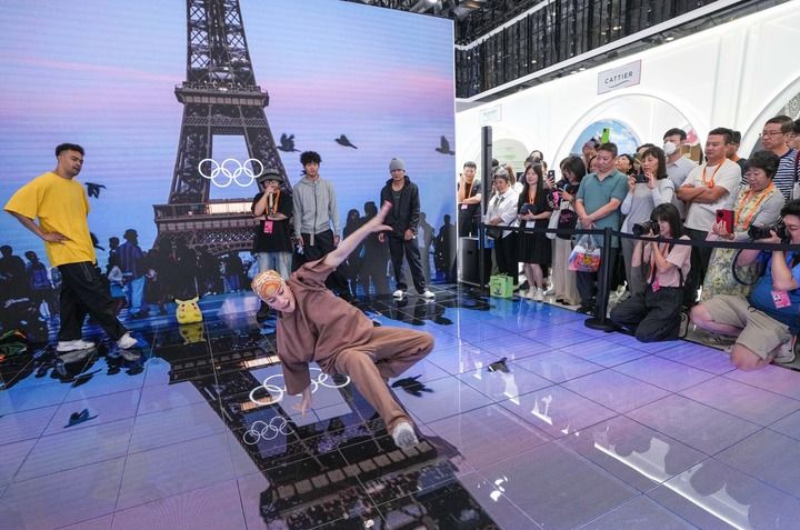 2024年9月14日,在2024年服贸会国家会议中心综合展区的主宾国法国展台,中法两国街舞好手在表演霹雳舞。新华社记者 陈晔华 摄