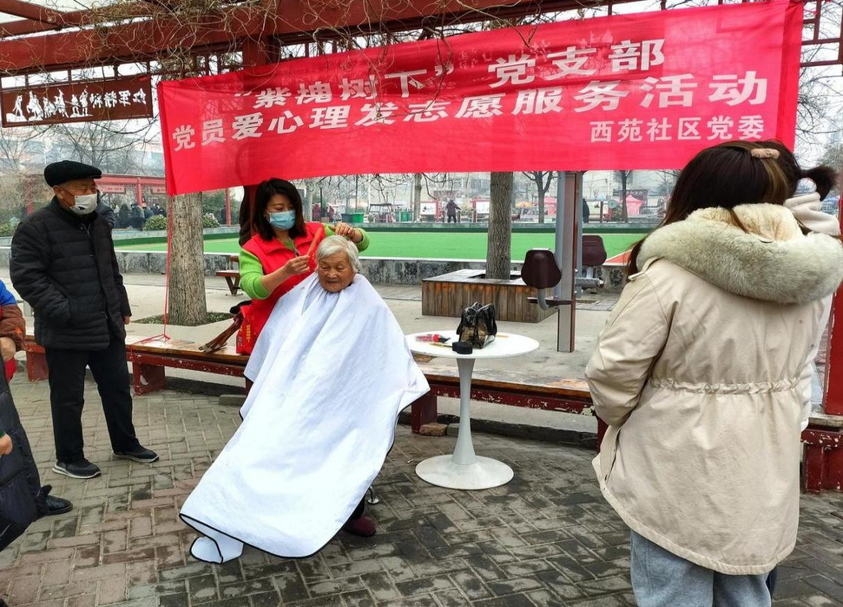 “紫槐树下”党支部文明实践志愿者为社区群众爱心理发。开封市文明办供图