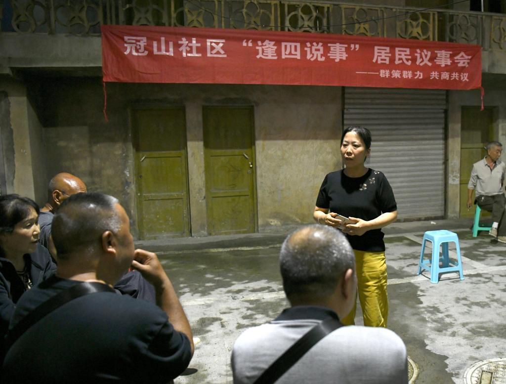 每周四是冠山社区的“议事日”。针对小区临时召开院坝会很难把居民聚在一起的实际,2024年以来,冠山社区在辖区网格定期召开“逢四说事”院坝会,组织党员、志愿者等现场跟群众一起“议社区大事、解居民难事、谈生活愁事、理邻里急事”。